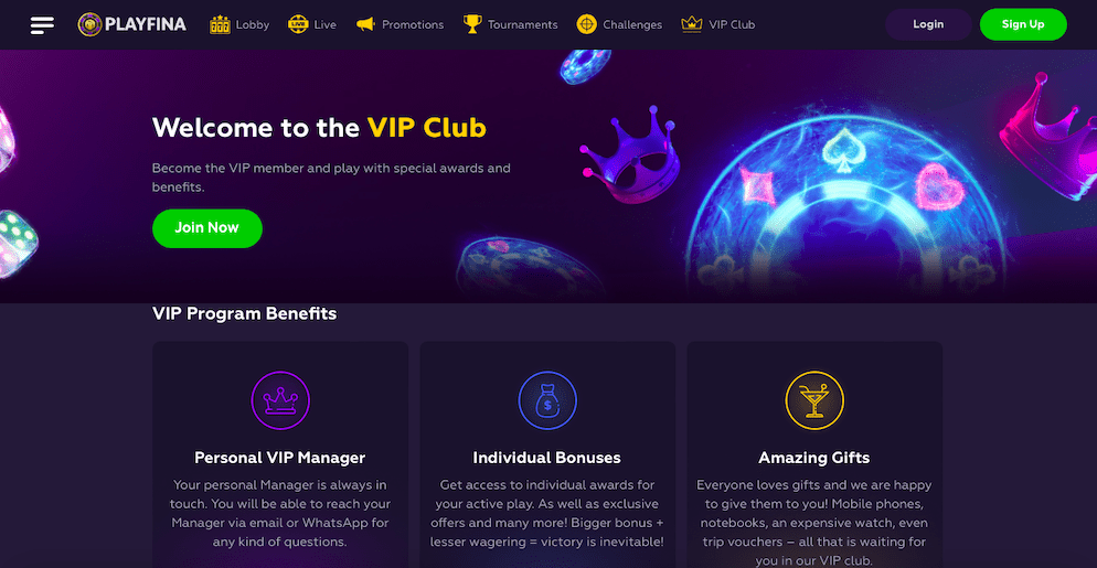 Playfina Casino offers an exclusive VIP program for its most loyal and high-rolling players. The VIP program is designed to reward players with personalized perks, exclusive bonuses, and special treatment.